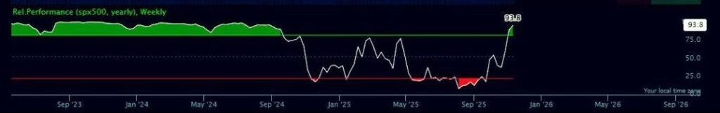 El indicador confirma que LLY ha sido un activo líder, con fuerte sobre-rendimiento frente al S&P 500 durante todo el período estudiado.